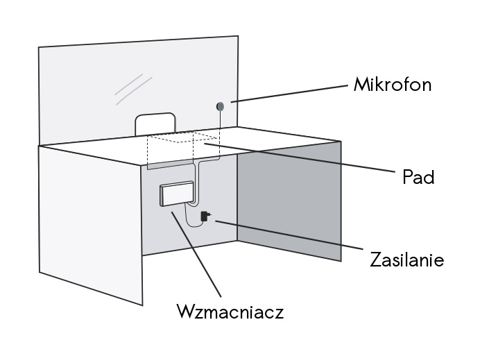 Pozostałe elementy to wzmacniacz pętli indukcyjnej oraz pad mocowany pod kasą czy biurkiem.